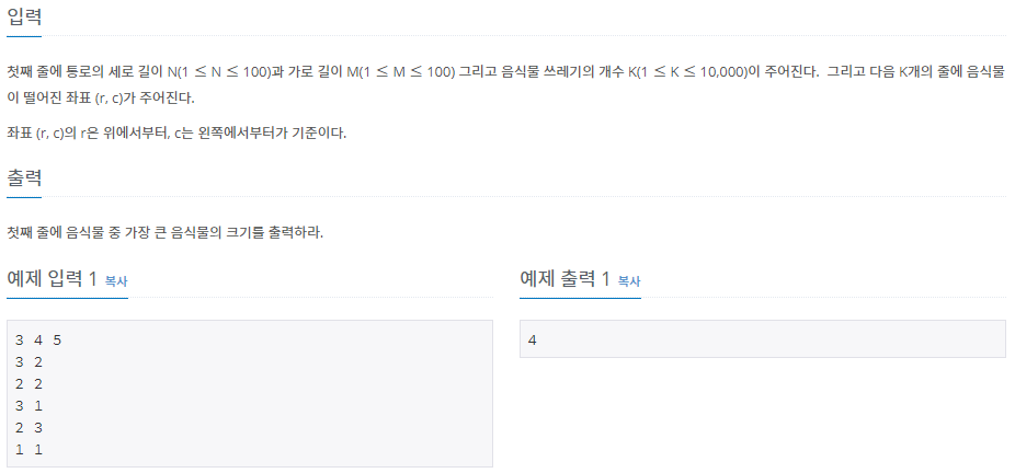 - 그리고 음식물 쓰레기의 위치에서 사방탐색을 진행해, 쓰레기의 크기를 구해줍니다.