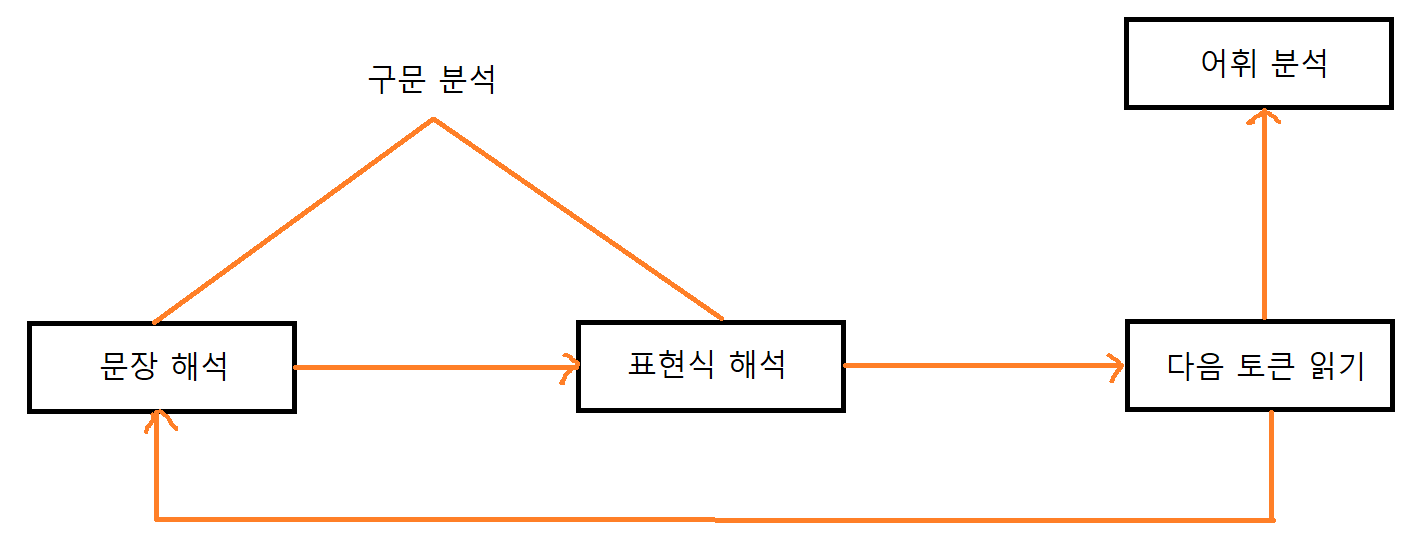 이때 구문 분석은 문장 해석 -> 표현식 해석을 주로 담당하고, 어휘 분석은 다음 토큰 읽기를 담당합니다.