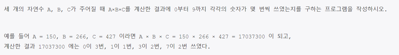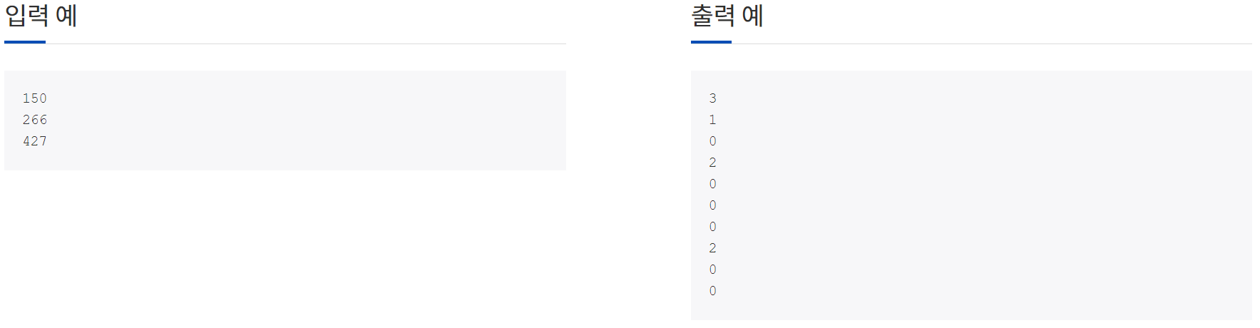 - 각각의 수를 곱한 다음 0~9의 인덱스에 숫자의 갯수만큼 더해주는 작업을 진행합니다.