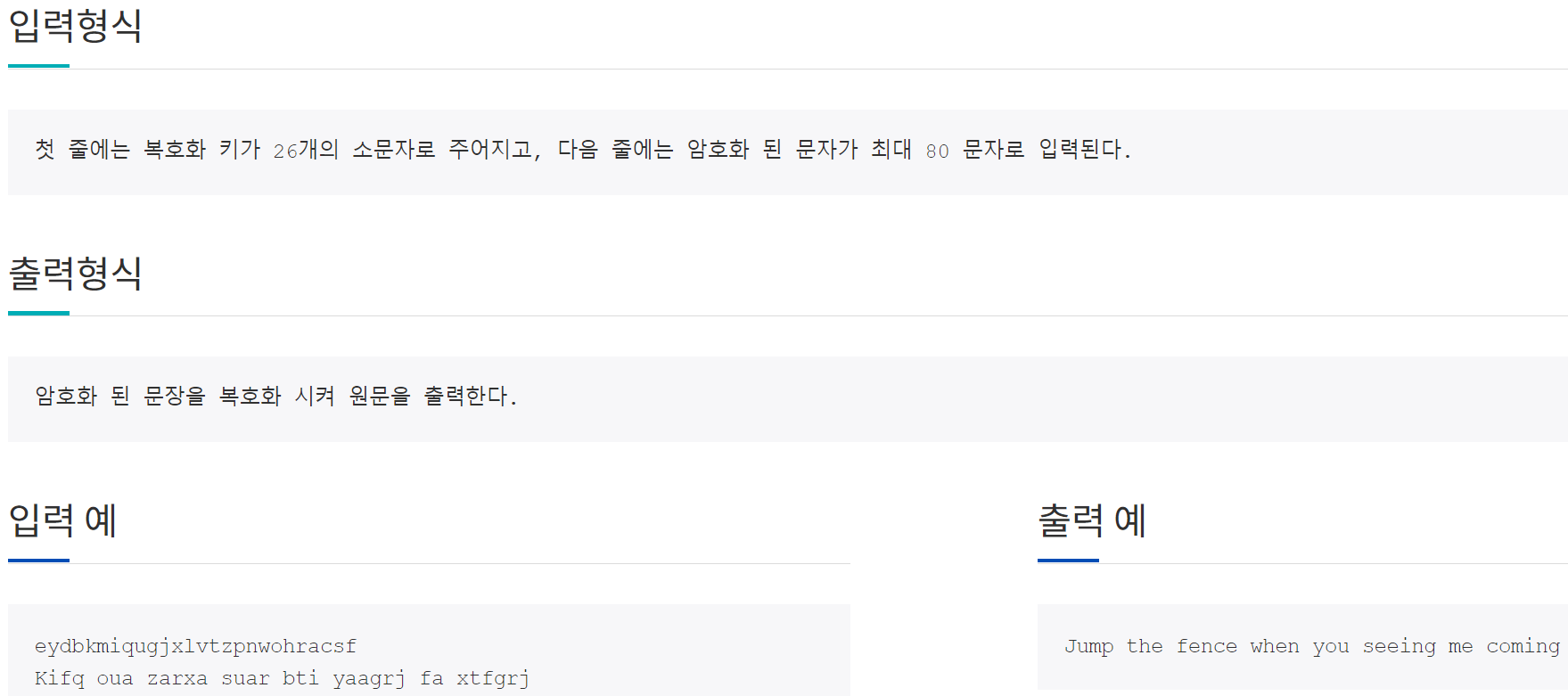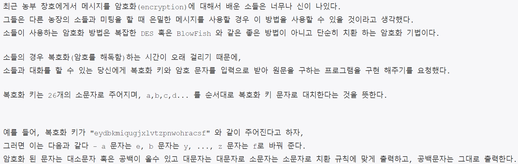 - 이 문제는 주어진 문장을 복호화 키를 통해서 암호문을 알아내는 문제입니다.