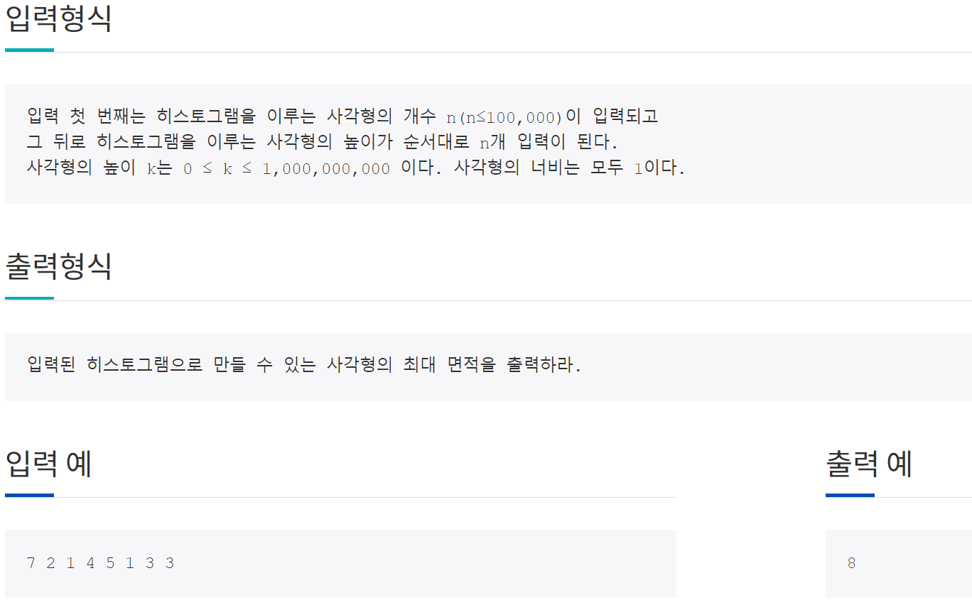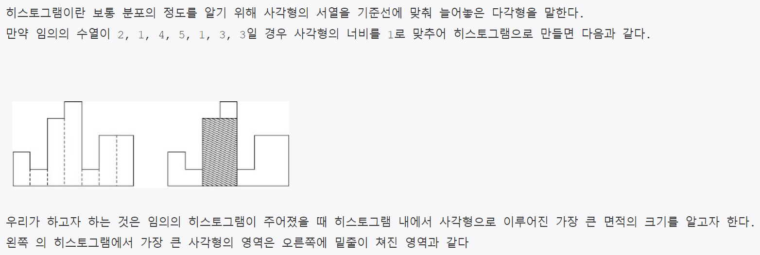- 히스토그램은 가장 넓은 사각형의 크기를 구하는 문제입니다.