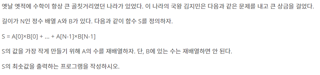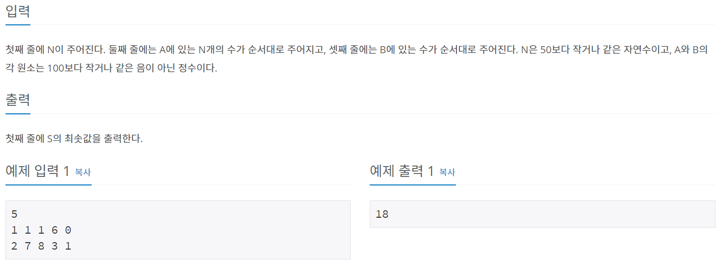 `- 각 배열의 숫자 곱의 합의 최솟값을 구하는 문제입니다.