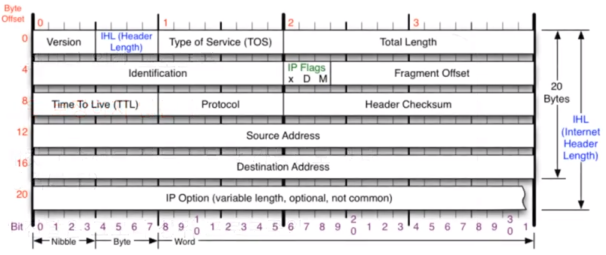 헤더의 길이이다. 헤더의 길이는 최소 20바이트부터 최대 60바이트의 크기를 가지기에 0부터 15까지의 수를 표현할 수 있는 4비트를 가지고 60바이트까지 표현하기 위해서 4를 곱한다. 0~15 표현 범위에 4를 곱하면 0~60까지를 표현할 수 있다. IPv6에서는 헤더의 크기가 항상 320바이트이기에 이 필드가 없다.