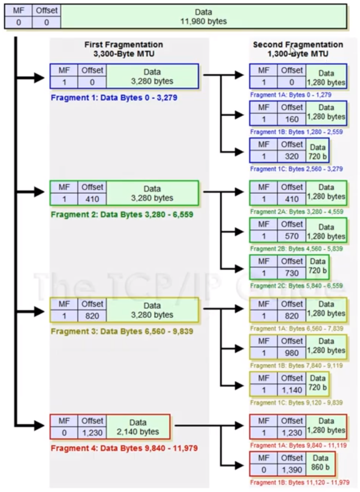 큰 IP 패킷들이 적은 MTU를 갖는 링크를 통하여 전송되려면 여러 개의 작은 패킷으로 쪼개어 / 조각화 되어 전송돼야 합니다.
