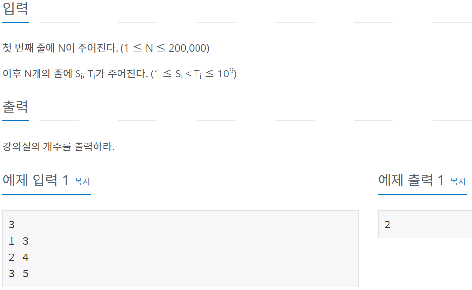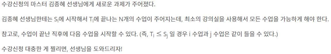 이 문제는 그리디 알고리즘을 이용하는 문제입니다. 저는 강의라는 클래스를 이용해서 문제를 해결했습니다. 클래스에 대한 정렬을 하기 위해서 Comparable를 상속 받아서 정렬을 진행했습니다. 문제를 제대로 읽지 않아서 들을 수 있는 최대 강의수로 착각해서 문제를 진행했었습니다....