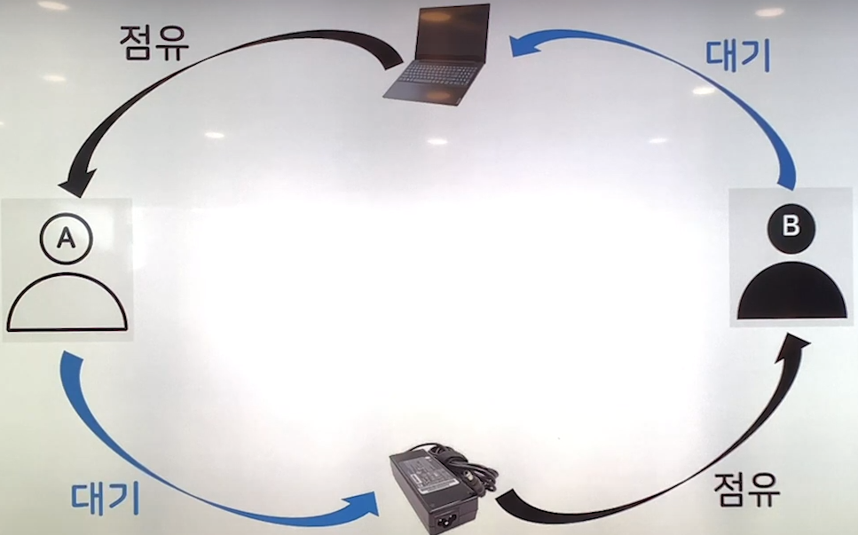 상호 배제에 의해 나타나는 문제점으로, 둘 이상의 프로세스들이 자원을 점유한 상태에서 서로 다른 프로세스가 점유하고 있는 자원을 요구하며 무한정 기다리는 현상을 의미합니다.