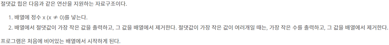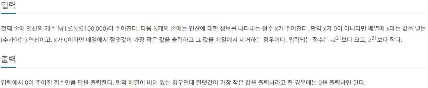 자료구조를 이용해서 해결하는 문제입니다. 일단은 값을 비교하기 위해서 우선순위큐를 만들어서 해결을 했습니다. 우선순위 큐를 만들 때, 비교 조건을 넣어주면 값이 들어올 때, 인덱스 위치가 변하게 됩니다. 0인경우 비어있을 때, 0 출력을, 비어있지 않은 경우, 들어있는 값 출력을 해줍니다. 0이 아닌 경우 값을 우선순위 큐에 넣어줍니다.