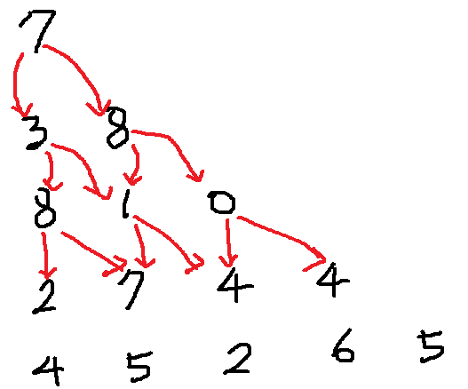 ※ 내 생각 이 문제는 DP를 이용해서 문제를 해결할 수 있습니다. 아래의 그림과 같이 규칙을 찾을 수 있습니다. 각각의 위치에 dp의 배열에 누적 합을 계산해 주면 됩니다. 단. dp에 대해서 최댓값을 비교하면서 구해줘야 합니다. 즉, 3행 2열의 1의 경우는 7 + 3 + 1 과 7 + 8 + 1 에 대한 최댓값을 고민해야 합니다...