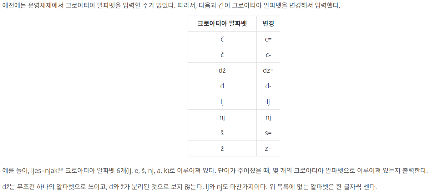이 문제는 문자열을 이용하면 쉽게 해결할 수 있는 문제입니다. 입력받은 문자열에 크로아티아 문자를 하나씩 돌려가며, 문자열에 포함이 되어있는지 확인을 해주면 됩니다. 확인된 문자열은 1글자의 다른 문자로 바꿔줍니다. 문자열의 길이를 출력해주면 됩니다. 목록에 없는 알파벳은 한 글자씩 세면 되기 때문에 다른 문자들에 대해서는 신경 쓸 필요가 없습니다.