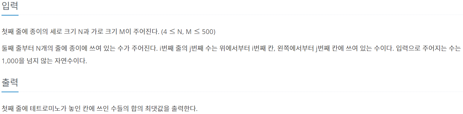 처음에는 DFS로 4칸에 대한 최댓값을 구했는데 실패했습니다. 생각해보니 한붓그리기가 불가능한 경우도 있었습니다.
