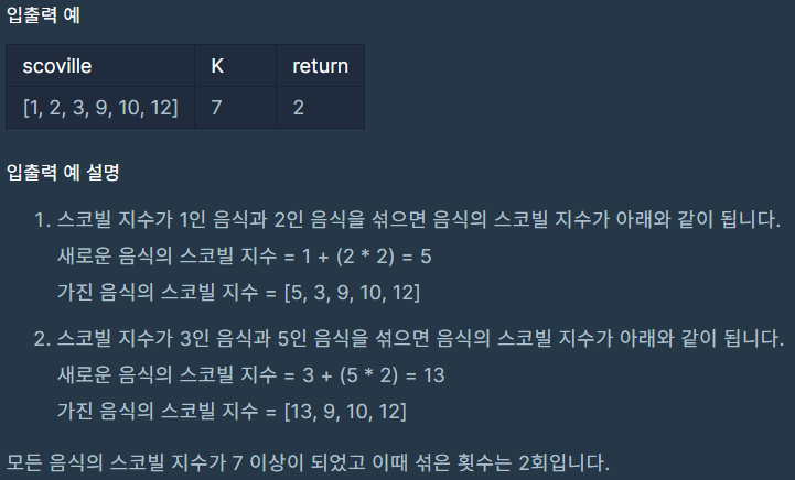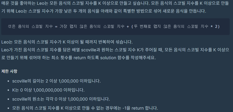 while문에서 종료 조건을 잘 설정 해줘야 합니다. 오름차순이므로 첫 값이 스코빌 지수 보다 작은 경우는 계속 돌려주면 됩니다.