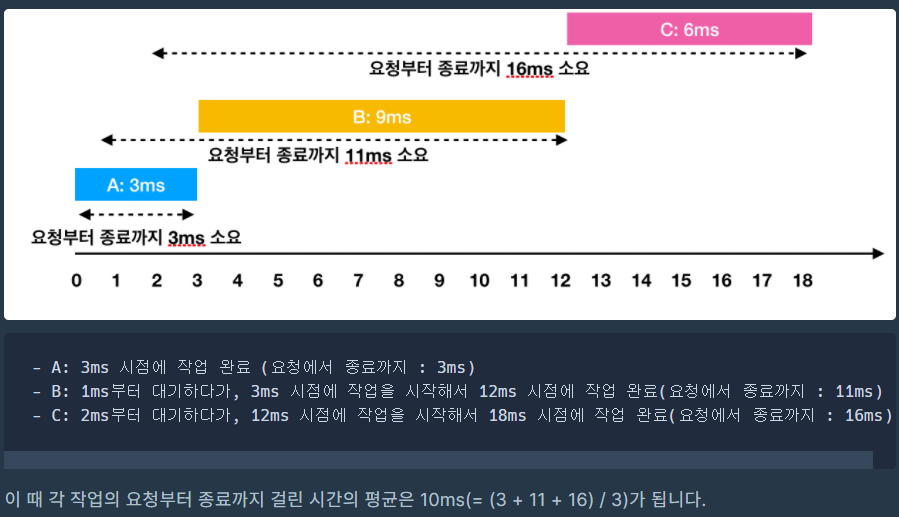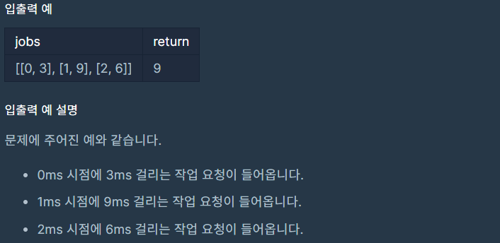 먼저 모든 작업을 LinkedList에 넣어줬습니다. 이때 요청을 기준으로 오름차순 정렬을 했습니다. 현재 시간 이하의 요청에 대한 작업은 PriorityQueue로 옮겨서 작업을 진행했습니다. 이때 또한 걸리는 시간을 기준으로 오름차순을 정렬을 했습니다. 작업이 완료 되면 answer에 더해줍니다. 작업이 없는 경우에는 요청 시작 시간만 늘려줍니다.
