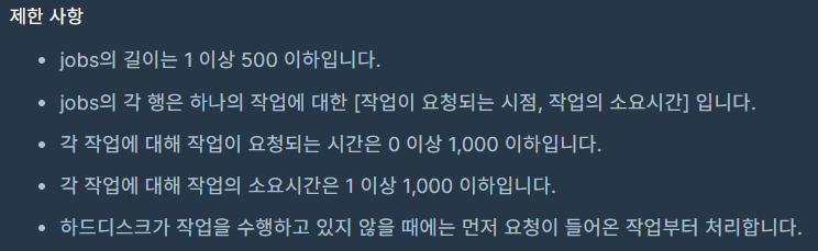 먼저 모든 작업을 LinkedList에 넣어줬습니다. 이때 요청을 기준으로 오름차순 정렬을 했습니다. 현재 시간 이하의 요청에 대한 작업은 PriorityQueue로 옮겨서 작업을 진행했습니다. 이때 또한 걸리는 시간을 기준으로 오름차순을 정렬을 했습니다. 작업이 완료 되면 answer에 더해줍니다. 작업이 없는 경우에는 요청 시작 시간만 늘려줍니다.