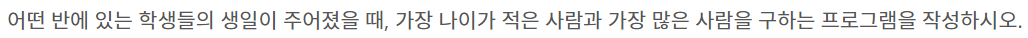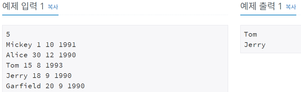 이 문제는 정렬을 이용하는 문제입니다. 먼저 연도, 월, 일을 비교하여 나이 순서대로 정렬을 진행합니다. 또한 정렬이 진행된 상태에서 0번 인덱스 및 마지막 인덱스를 출력하면 됩니다.
