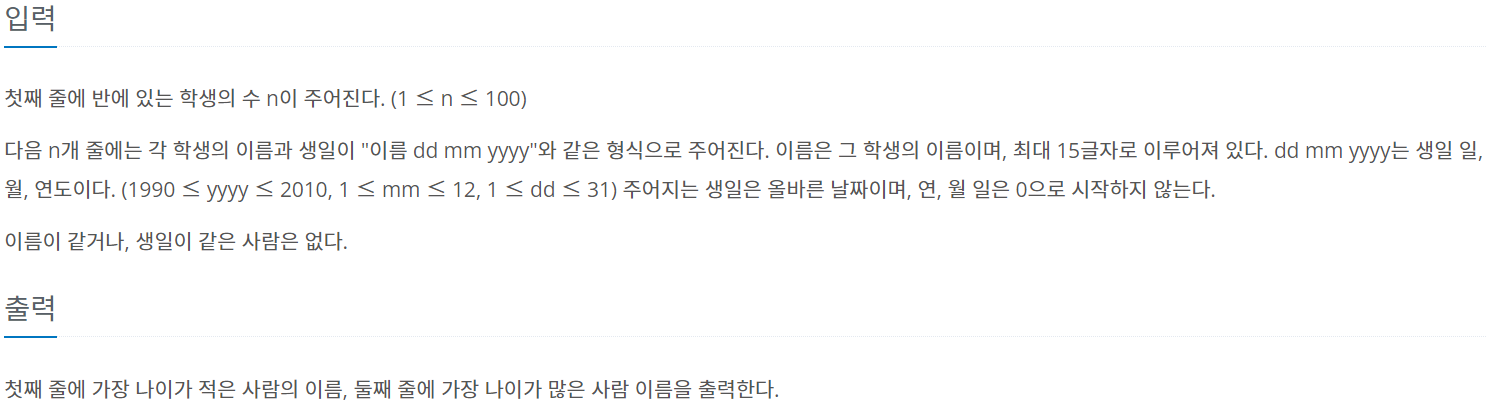 이 문제는 정렬을 이용하는 문제입니다. 먼저 연도, 월, 일을 비교하여 나이 순서대로 정렬을 진행합니다. 또한 정렬이 진행된 상태에서 0번 인덱스 및 마지막 인덱스를 출력하면 됩니다.