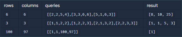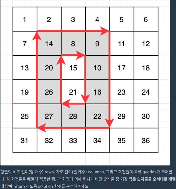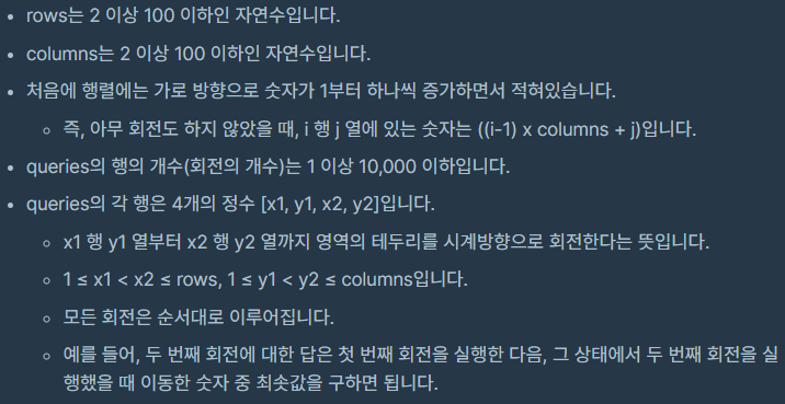 먼저 주어진 크기 만큼의 배열을 만들어 줍니다. 그리고 for문을 이용해서 queries 의 각각의 원소의 좌표를 얻습니다. 얻어낸 좌표를 통해서 상 하 좌 우 각각을 for문을 이용하여 한칸씩 옴겨줍니다. 옴겨지는 과정에서 최솟값을 파악하고 작업이 끝나면 answer에 값을 넣어줍니다.