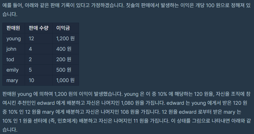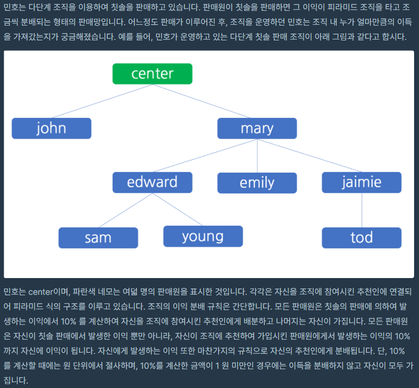 이익금을 계산하고 10프로씩 위로 올려 보내는 식으로 코드를 짯습니다.