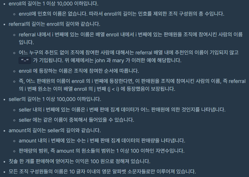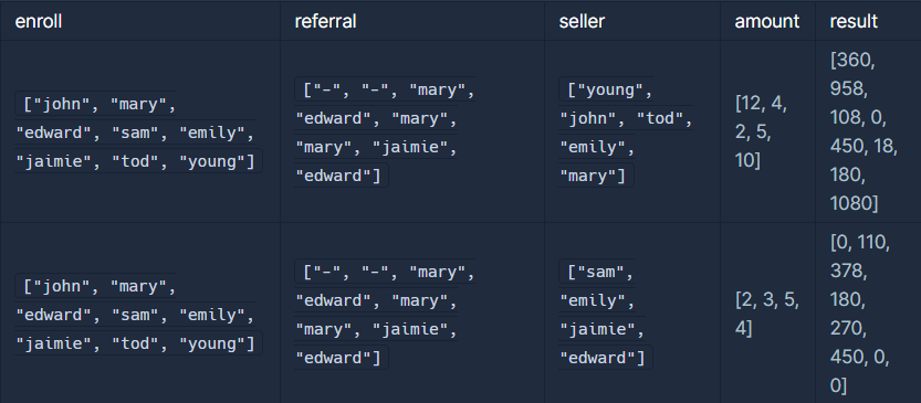 public int[] solution(String[] enroll, String[] referral, String[] seller, int[] amount) {