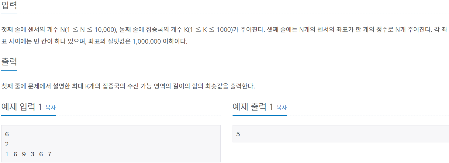 먼저 처음에 K개의 집중국이 센서보다 많으면 0을 출력하고 끝이 납니다.