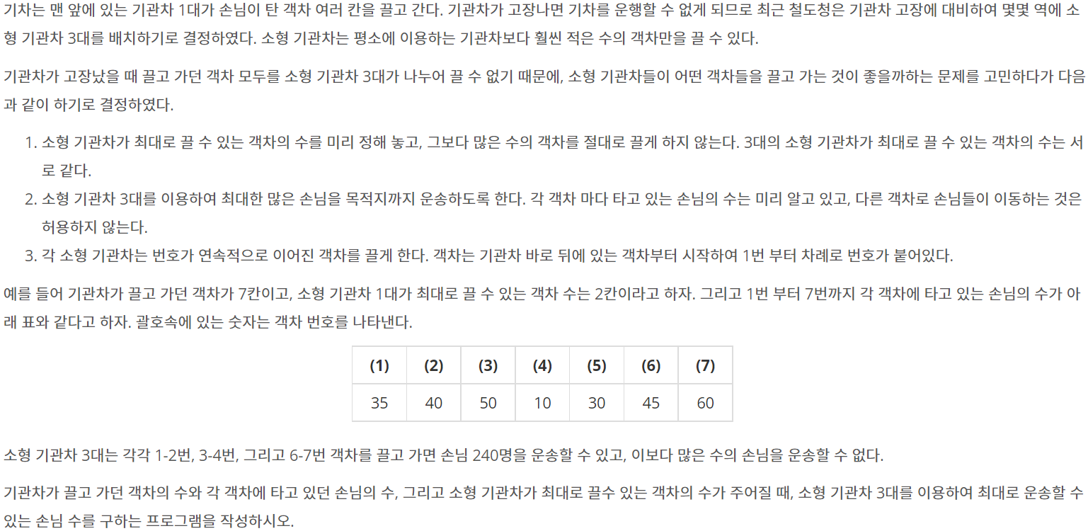 sum에 arr에 대한 누적값을 담아줍니다. DP를 이용해서 3개의 소형 기관차에 들어갈 수 있는 손님의 수를 넣어줍니다.