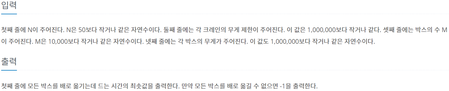 각각에 담겨있는 배열을 내림차순으로 정렬하면 됩니다. 첫 값이 크레인보다 박스 무게가 크다면 옮길 수 없기 때문에 -1을 출력합니다. for문을 통해 박스를 담는 작업을 진행하면 됩니다.