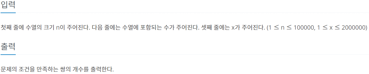 투 포인트를 이용해서 합과 찾고자 하는 값이 같으면 정답과 시작 값을 더해줍니다. 찾고자 하는 값이 더 크면 처음 값을 더해줍니다. 합이 더 크면 마지막 값을 빼서 합을 줄여줍니다.