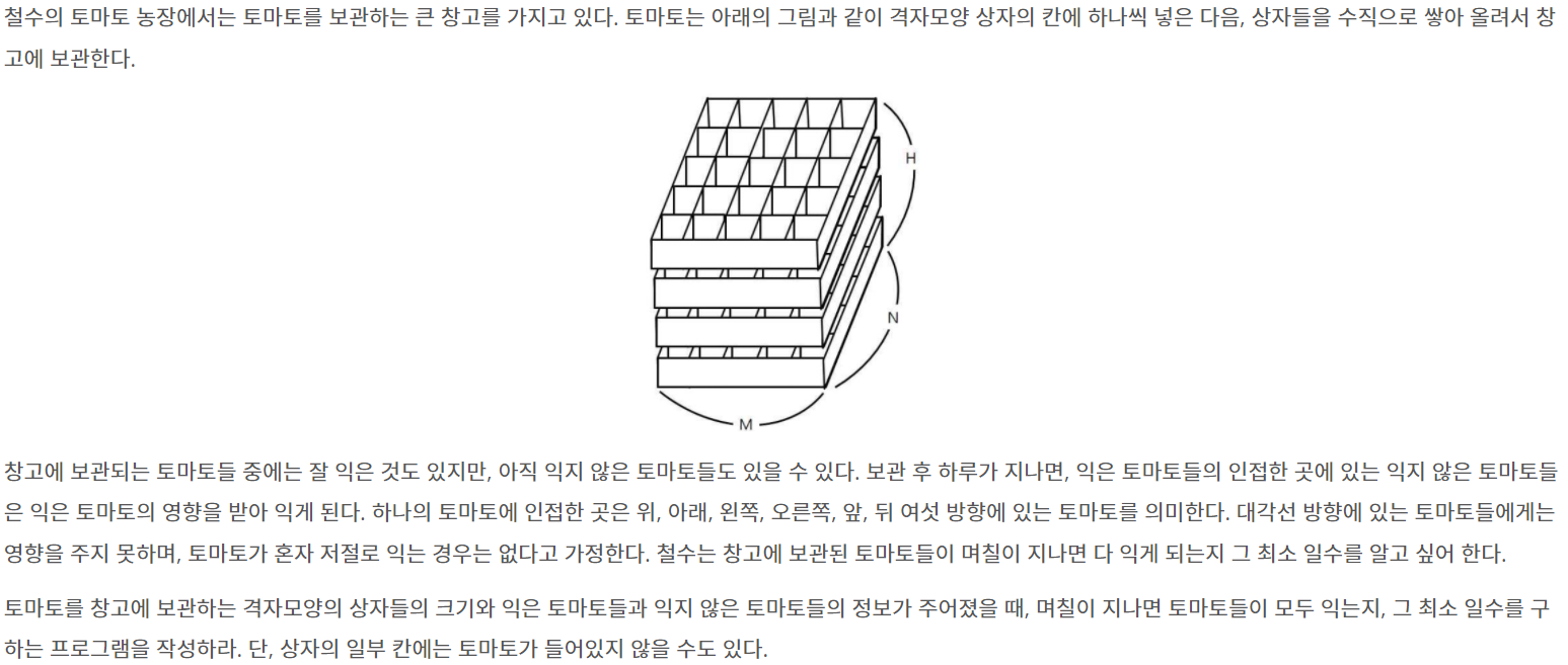 3차원 배열 식으로 푸는 문제였고, 방문 여부를 익지 않은 토마토에 대해서만 큐에 담아주는 식으로 풀어주면 됩니다.