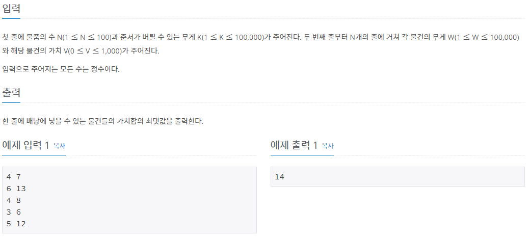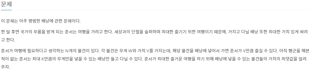 - 평범한 배낭의 문제의 경우에는 DP를 이용해서 문제풀이를 진행했습니다.