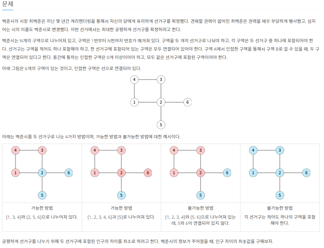 - 게리 멘더링의 문제를 읽어보면 N개의 갯수를 조합을 이용해서 나눠주는 과정이 필요하고, 이때의 BFS또는 DFS를 이용해서 연결이 되어 있는지 확인후에, 인구의 수를 구한다음 그 차이를 해결하는 문제인거 같습니다.