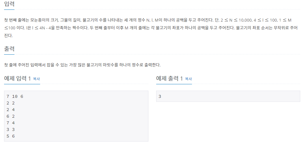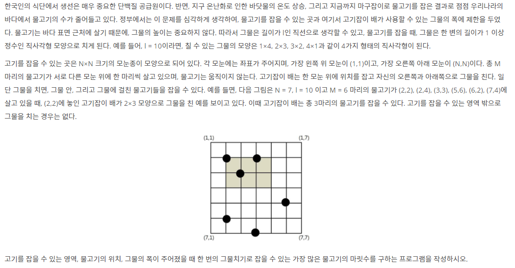 //모눈종이 크기, 그물의 길이, 물고기의 수
